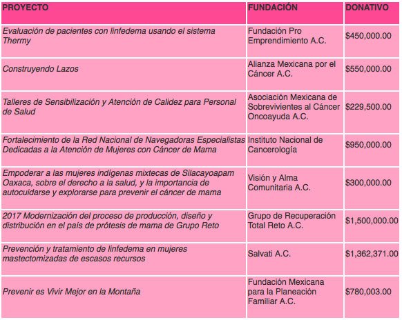 Tras 24 años de apoyo a la lucha contra el Cáncer de Mama, Avon México ha sensibilizado a más de 22 millones de mujeres y apoyado activamente las etapas de detección oportuna, investigación, tratamiento y reconstrucción. Este año, esa cifra crecerá mucho más gracias a un donativo de 8 millones 742 mil 955 pesos, el cual se destinará a 15 proyectos de 14 Fundaciones ganadoras de la Convocatoria Promesa Avon contra el Cáncer de Mama 2017.
