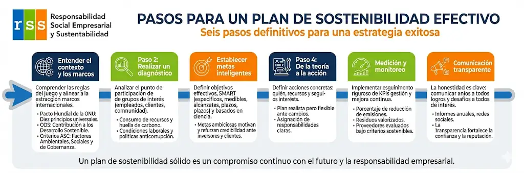 Para elaborar un plan de sostenibilidad efectivo, se deben seguir seis pasos definitivos: primero, entender los marcos globales (como los ODS y ASG); segundo, realizar un diagnóstico actual; tercero, establecer metas basadas en la ciencia; cuarto, convertir objetivos en acciones concretas; quinto, medir avances con indicadores clave (KPIs); y finalmente, comunicar los resultados con transparencia a todos los grupos de interés.